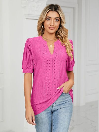 Florira Eyelet Notched Short Sleeve T-Shirt