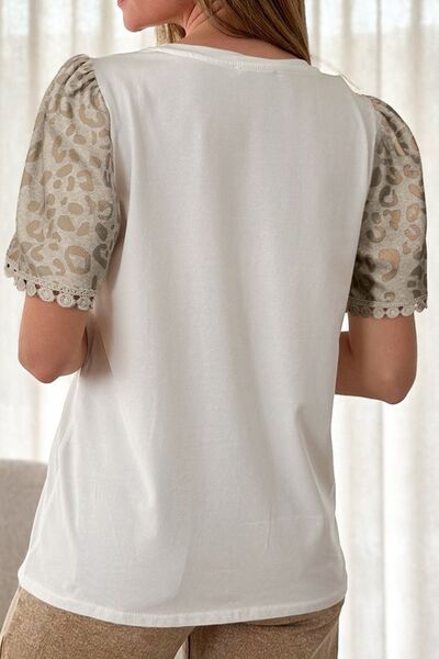 Leopard Patchwork Crochet Lace Trim Puff Sleeve T Shirt